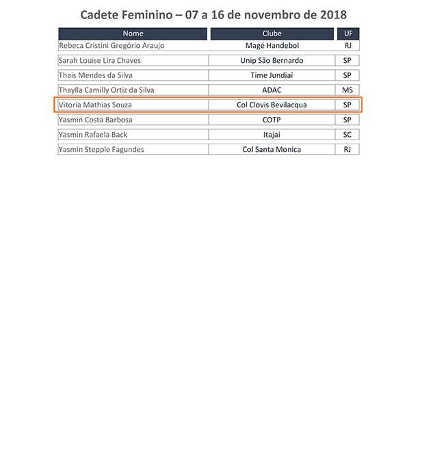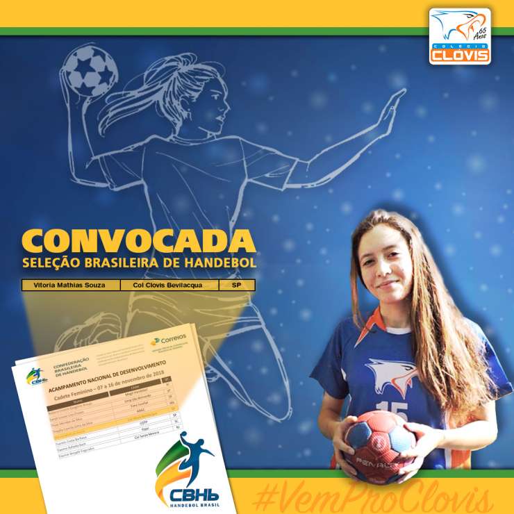 É com muita felicidade que recebemos a notícia que nossa aluna do 1º ano de Publicidade, VITÓRIA MATHIAS SOUZA, foi CONVOCADA para a fase de treinamento com SELEÇÃO BRASILEIRA CADETE FEMININA, que acontecerá entre os dias 07 a 16 de novembro na cidade de São Bernardo do campo. Boa sorte Vitória, temos a certeza que você representará muito bem o Colégio Clóvis Bevilácqua. Você é motivo de orgulho para todos nós!